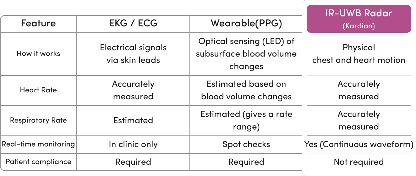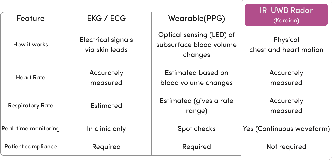 Most health devices measure light (ppg) bouncing off your blood or electrical signals from your skin, then use algorithms to ESTIMATE your vital sign values. XK uses radar to detect the actual physical motion of your heart beating and your chest rising. Continuous, contactless, and complete.