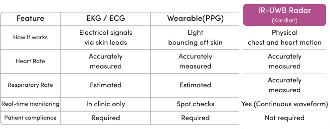 Most health devices measure light (ppg) bouncing off your blood or electrical signals from your skin, then use algorithms to ESTIMATE your vital sign values. XK uses radar to detect the actual physical motion of your heart beating and your chest rising. Continuous, contactless, and complete.